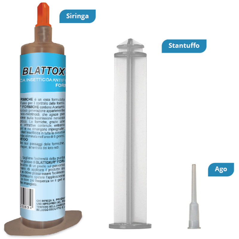 Insetticida in formulazione gel (cartucce) per il controllo delle formiche, applicabile in ambienti domestici e civili. Le formiche, grazie alle sostanze altamente attrattive contenute , entrano in contatto con il gel e ne rimangono impregnate; segue la diffusione dell’insetticida in tutta la colonia che viene interamente eliminata nell’arco di 24 ore. Da applicare con apposita pistola applicatrice oppure impiegando lo stantuffo e i 2 aghi in plastica inclusi nella confezione.